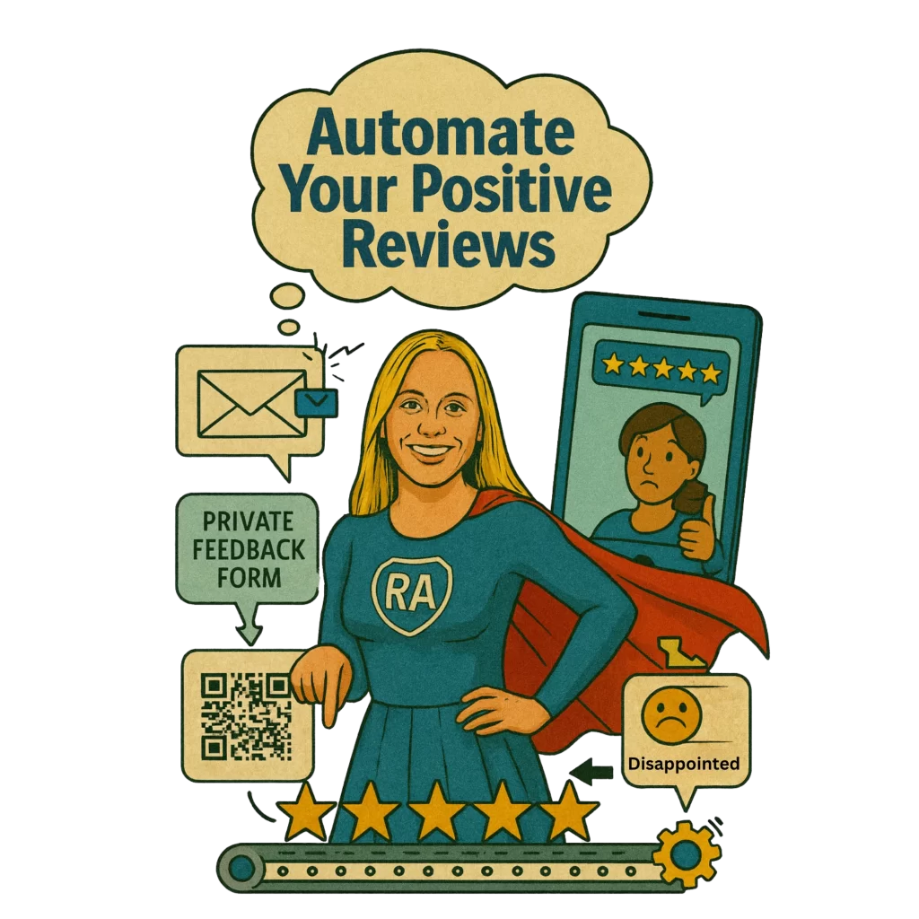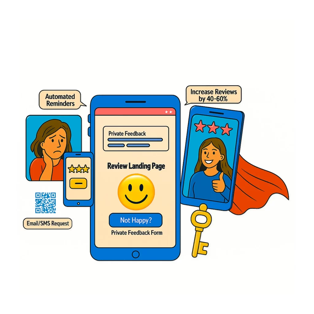We install a beautiful, simple Review Landing Page with a ‘happy?’ button for positive reviews and a private feedback form for unhappy customers. Complete with QR codes, email/SMS request links, and automated reminders that increase reviews by 40-60%. Your best customers finally leave reviews while unhappy ones never go public.